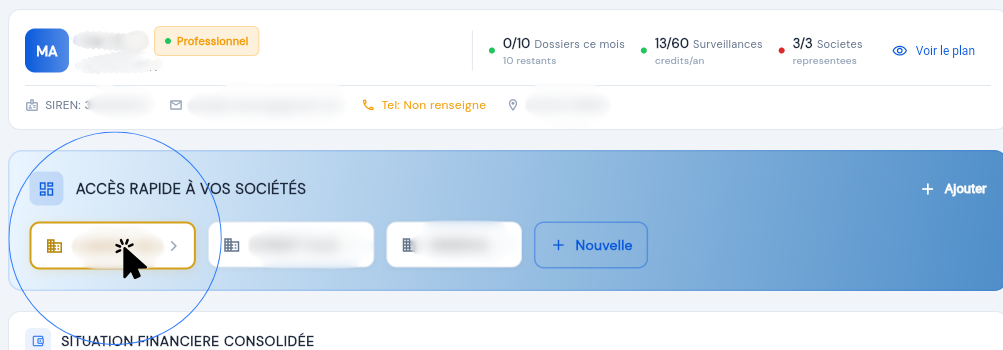 Vous trouverez dans cet espace le nombre d’entreperises en surveilance. Selon votre abonnement le nombre de surveillance disponible peut être plus ou moins élevé.