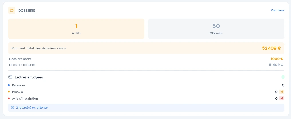 Dossiers ce mois : nombre de dossiers créés sur la période en cours.