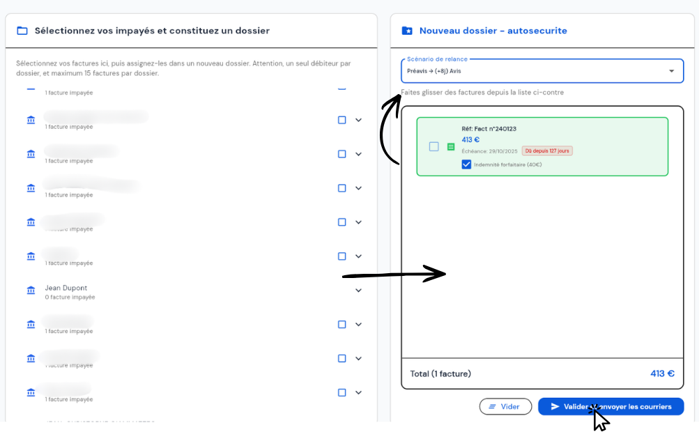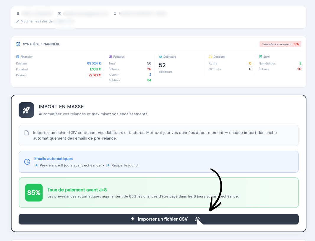 En quelques étapes, vous pouvez importer vos factures, suivre leur état et lancer les actions adaptées (relance, préavis ou avis d’inscription).