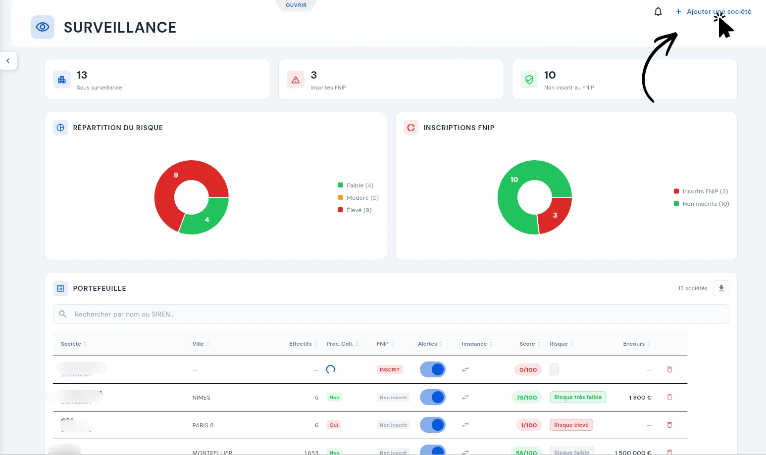 Sur la page Surveillance, cliquez sur le bouton « Ajouter une société » situé en haut à droite.